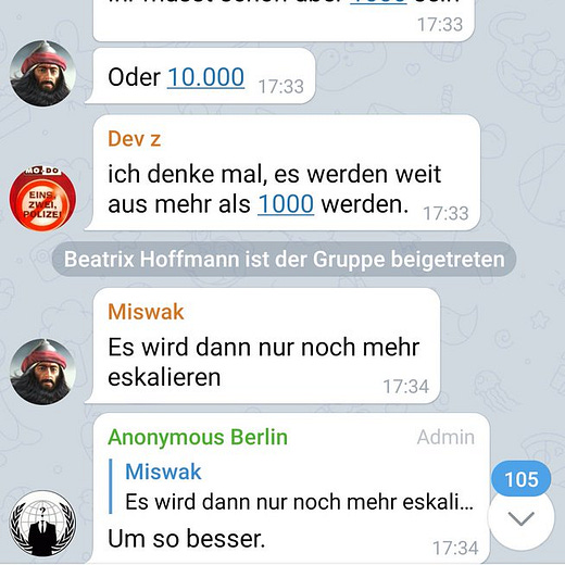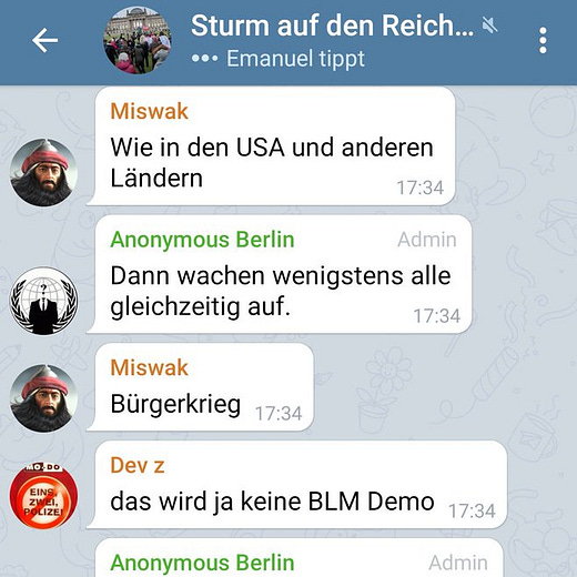Das Anonymous-Label ist praktisch: Jeder kann sich Anonymous nennen. Hervorgegangen 2010 aus dem Imageboard 4chan und der Hacktivist-Szene, war die Anonymous-Bewegung noch nie politisch homogen. Von links- bis rechtsradikalen Accounts agiert hinter der Anonymität der Maske das gesamte politische Spektrum. Anonymous Germany, auch bekannt unter AnonLeaks /AnonNewsDE, ist dem Spektrum der maßnahmenbefürwortenden, regierungstreuen Antifa zuzuordnen. Das Kollektiv hackte die Webseite von Attila Hildmann, unterwanderte die Partei Widerstand2020 mit Fantasieprofilen, leakte Unterlagen der FDP und arbeitete sich seit 2020 vorrangig an sogenannten “Schwurblern” ab: So leakten sie die Mitgliederliste der Partei DieBasis, gaben sich auf Telegram nach dessen BILD-Rauswurf als Julian Reichelt aus, und kündigten unter den Hashtags #OpKalteWut / #OpTinfoil / #OpJustitia Aktionen gegen sogenannte Querdenker an. Anonymous Germany ist nicht auf Telegram und distanziert sich von QAnon, doch auf Telegram existieren diverse Anonymous-Kanäle, die QAnon-Inhalte verbreiten. Sowohl QAnon als auch Anonymous sind perfekte Werkzeuge für Geheimdienste, um gewünschte Inhalte diskret in bestimmten Echokammern zu platzieren. Bei dem Anon, der in den Wochen vor dem 29. August 2020 zum Sturm auf den Reichstag aufrief, handelt es sich aller Wahrscheinlichkeit nach um den Reichsbürger Christoph Kastius. Ob Kastius für den Verfassungsschutz arbeitet, ist nicht bekannt, doch selbiges wirft er Rüdiger Hoffmann, dem Anmelder des 29. August 2020, vor - mit der Begründung, dieser bekäme an allen wichtigen Daten vor dem Reichstag seine Bühne genehmigt, wohingegen er selbst daran immer wieder scheitere. Beide sind vorbestraft, beide haben eine Vorgeschichte regelmäßiger Aufrufe zum “Sturm auf den Reichstag”, beide sind in die Geschehnisse zum 29. August 2020 verwickelt.