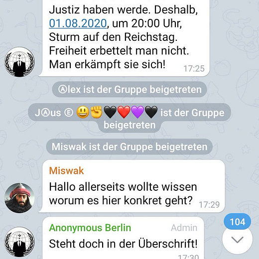 Die Duldung einer Reichsbürger-Bühnenveranstaltung direkt vor dem Reichstag erscheint noch fragwürdiger in Anbetracht der Tatsache, dass es im Vorfeld sowohl für den 01. Mai, den 01. August als auch den 29. August recht unmissverständliche Hinweise auf Twitter, Telegram und YouTube gab, dass der Reichstag zum Ziel einer Stürmung werden könnte. Der Polizei waren diese Vorgänge bekannt. Es gab sogar eine Telegram-Gruppe namens „Sturm auf den Reichstag“ mit 126 Mitgliedern. Hinter dem Admin der Gruppe, einem gewissen “Anonymous Berlin” vermuten Beobachter der Szene den Rechtsextremisten Christoph Kastius.