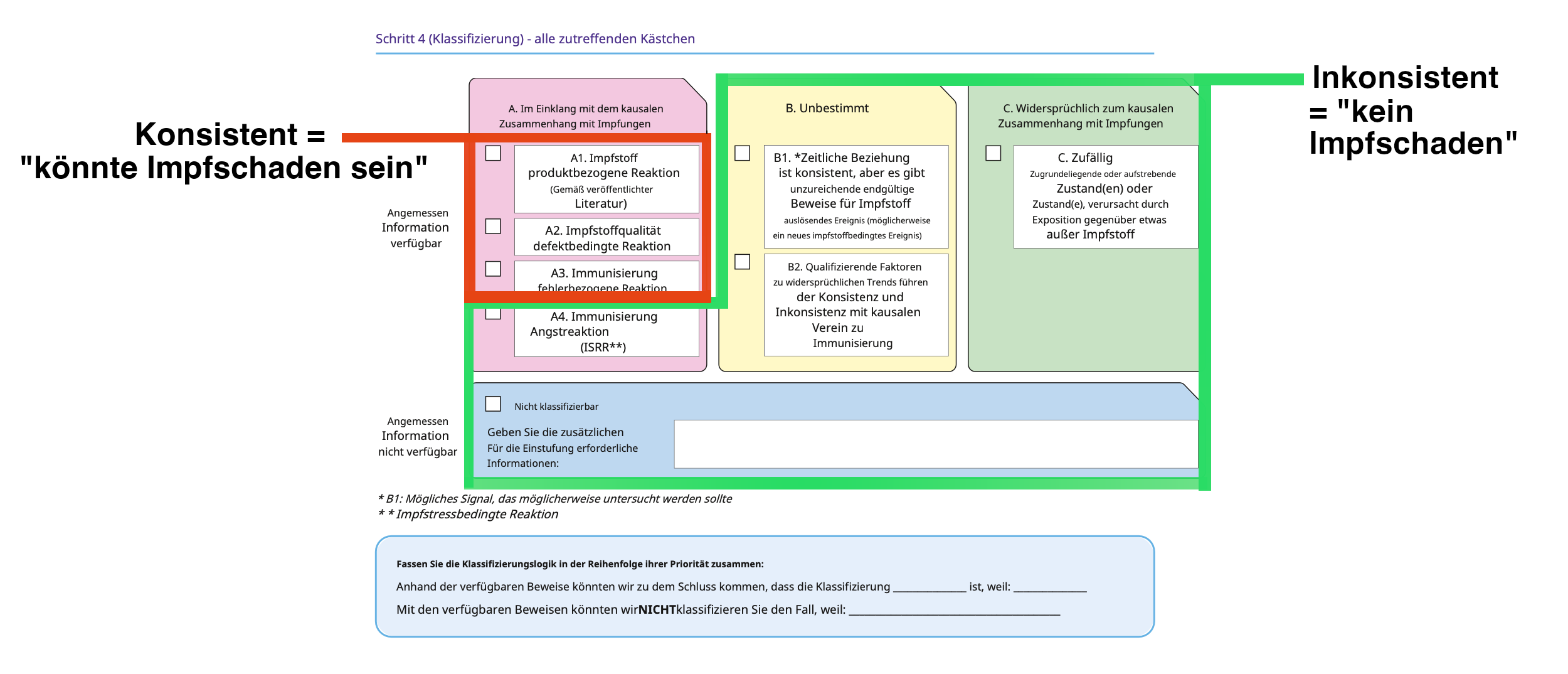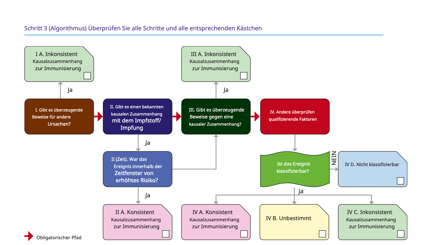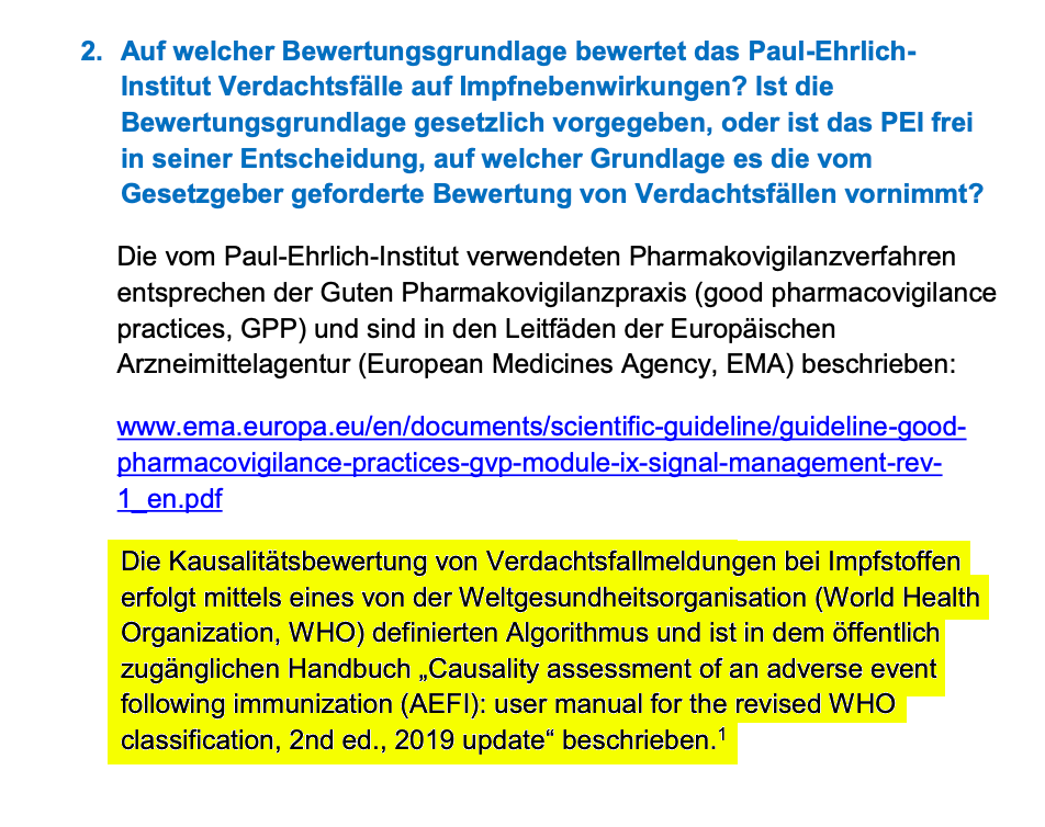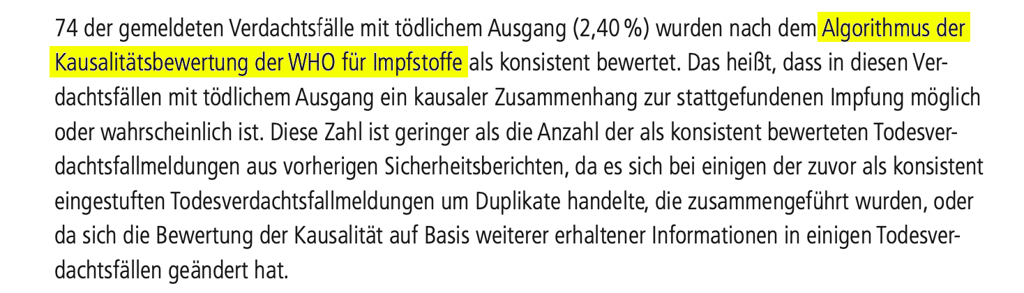 „Die Kausalitätsbewertung von Verdachtsfallmeldungen bei Impfstoffen erfolgt mittels eines von der Weltgesundheitsorganisation (World Health Organization, WHO) definierten Algorithmus und ist in dem öffentlich zugänglichen Handbuch 'Causality assessment of an adverse event following immunization (AEFI): user manual for the revised WHO classification, 2nd ed., 2019 update’ beschrieben.“
