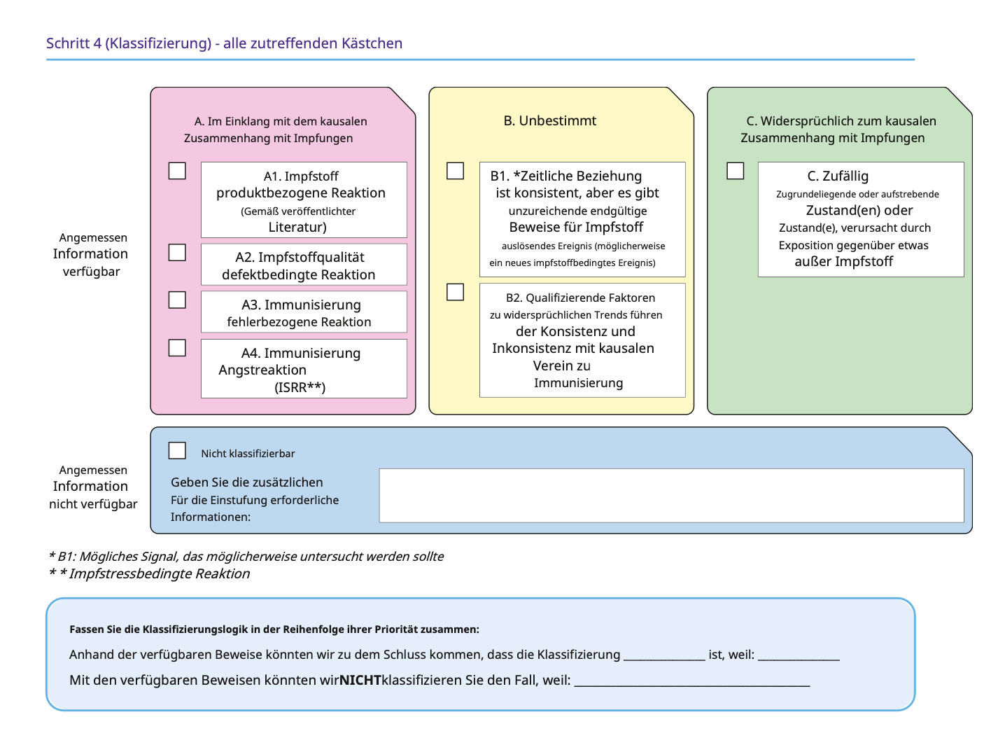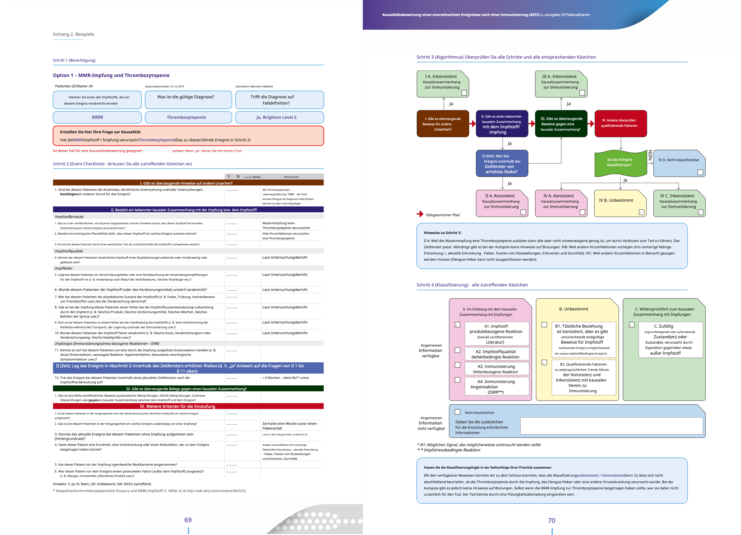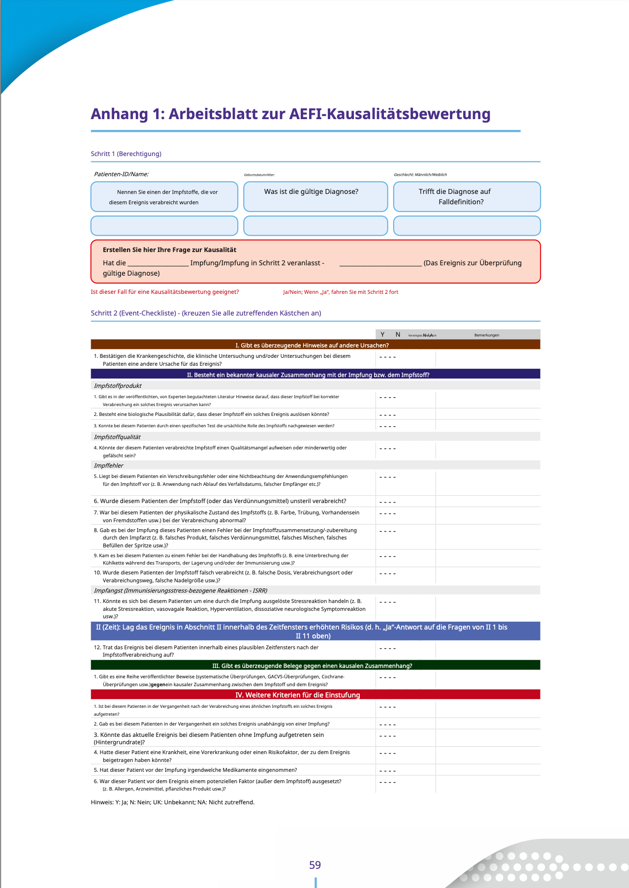 „Die Kausalitätsbewertung von Verdachtsfallmeldungen bei Impfstoffen erfolgt mittels eines von der Weltgesundheitsorganisation (World Health Organization, WHO) definierten Algorithmus und ist in dem öffentlich zugänglichen Handbuch 'Causality assessment of an adverse event following immunization (AEFI): user manual for the revised WHO classification, 2nd ed., 2019 update’ beschrieben.“