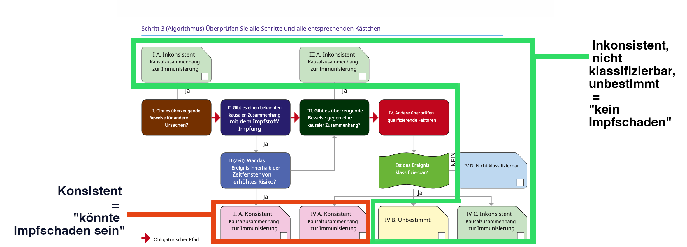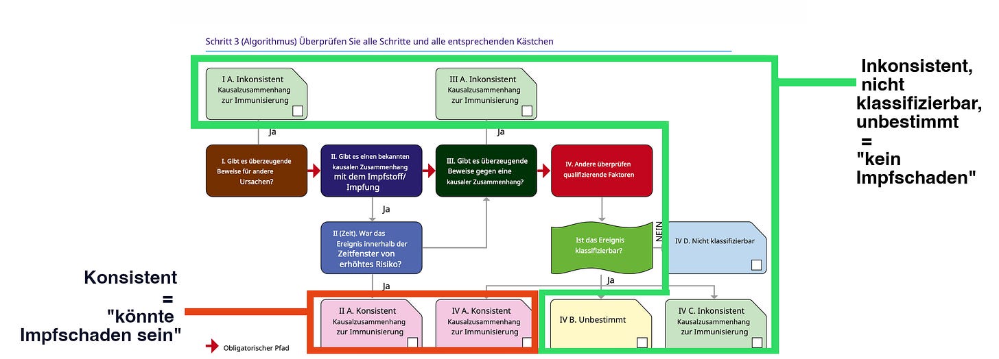 Dabei fällt auf, dass es nicht nur eine, sondern gleich drei verschiedene Möglichkeiten gibt, für einen Impfschaden disqualifiziert zu werden: Der Fall heißt dann „inkonsistent“, „unklassifizierbar“ oder „unbestimmt“. Fünf mögliche Pfade des Flussdiagramms führen zu „inkonsistent“, „unbestimmt“ und „unklassifizierbar“, wodurch ein Kausalzusammenhang zur Impfung ausgeschlossen wird. Lediglich zwei von sieben möglichen Pfaden des Flussdiagramms führen zu „konsistent“, und damit der „Möglichkeit“ eines Impfschadens.
