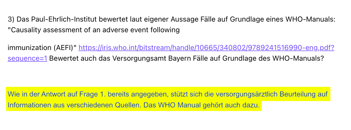 Das Versorgungsamts Bayern gab in seiner Antwort auf meine Presseanfrage an, dass die versorgenden Ärzte im Versorgungsamt Bayern sogar selbst mit dem WHO-Handbuch arbeiten würden: Diese zögen demnach bei der Bewertung von Impfschäden “verschiedene Quellen” heran - das WHO-Manual gehöre auch dazu: