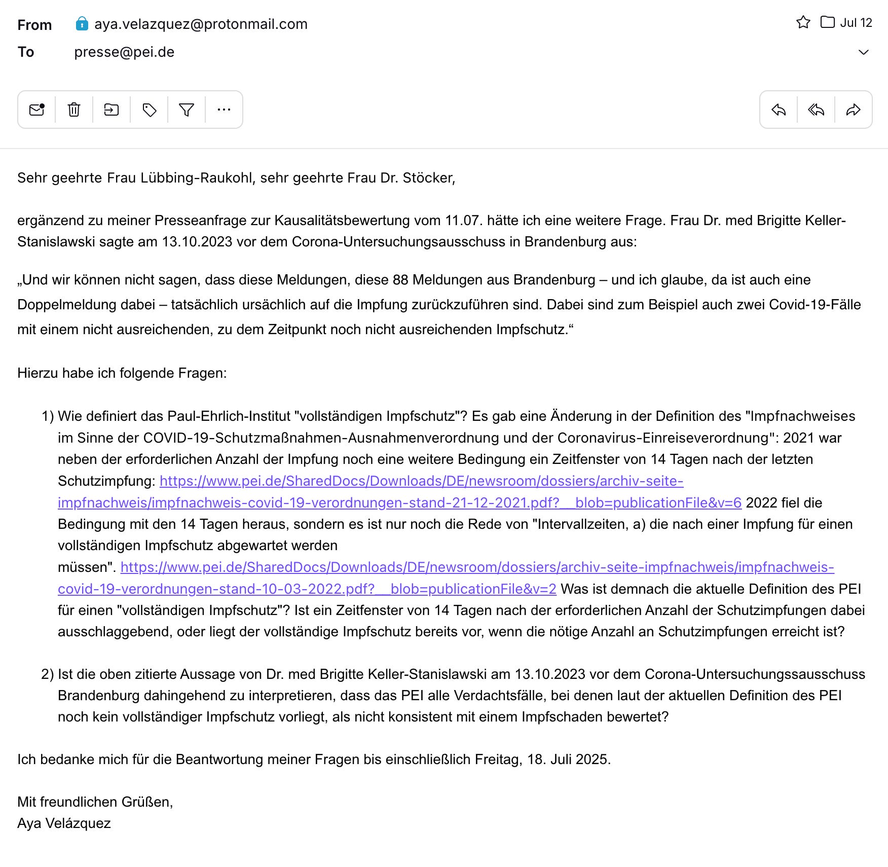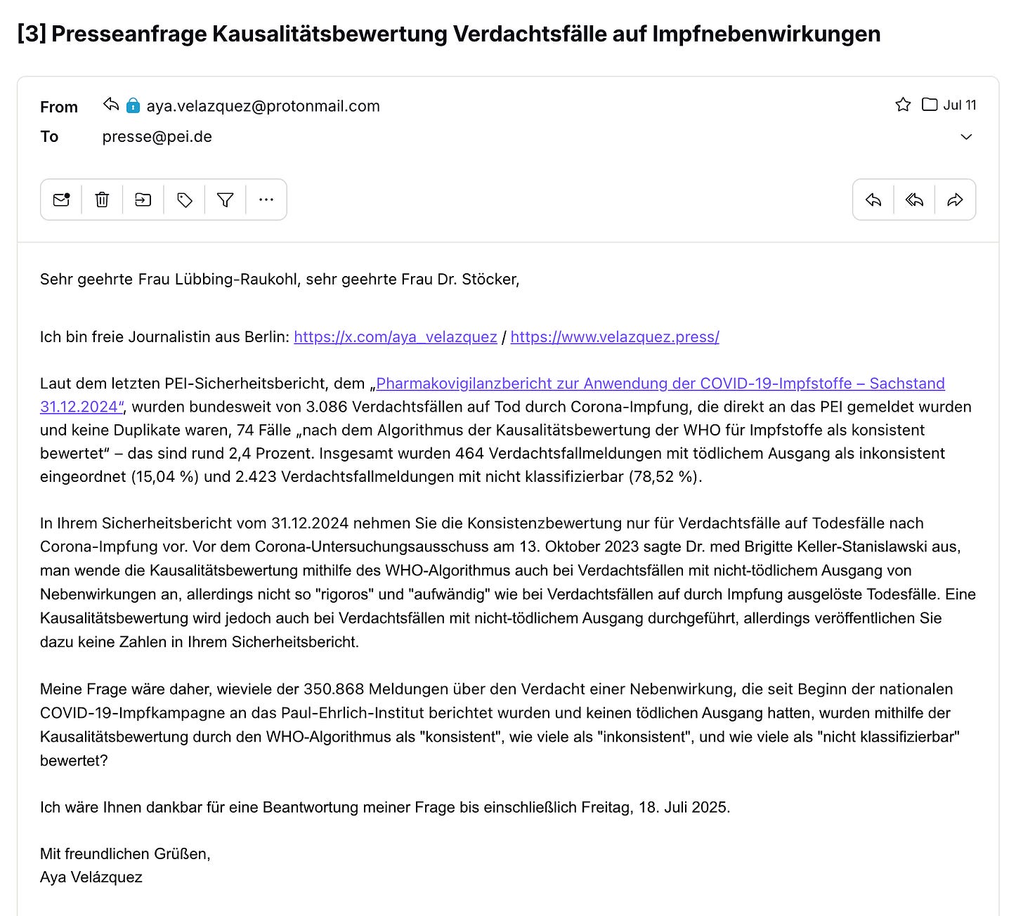 Eine Presseanfrage meinerseits an das PEI vom 11. Juli 2025, wieviele der 350.868 Meldungen über den Verdacht einer nicht-tödlichen Nebenwirkung, die seit Beginn der nationalen COVID-19-Impfkampagne an das Paul-Ehrlich-Institut gemeldet wurden, mithilfe des WHO-Algorithmus als "konsistent", "inkonsistent", und "nicht klassifizierbar" bewertet wurden, hat die Behörde bis zum Zeitpunkt der Veröffentlichung dieses Artikels noch nicht beantwortet.