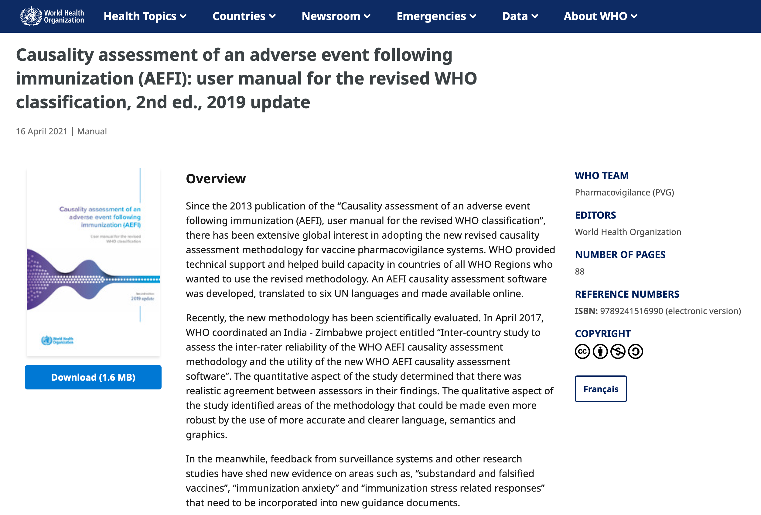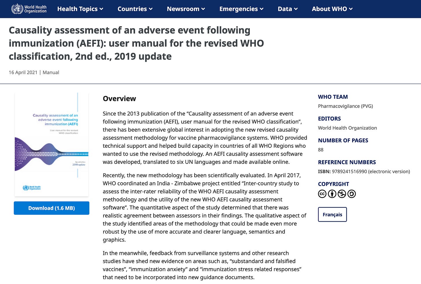 Der WHO-Algorithmus beruht auf einem WHO-Handbuch zur Klassifizierung von Impfschäden aus dem Jahr 2018, das in den Jahren 2019 und 2021 überarbeitet wurde – Vorläufer-Versionen des Handbuchs gibt es bereits seit 2013. Es trägt den sperrigen Titel „Causality assessment of an adverse event following immunization (AEFI): user manual for the revised WHO classification“. Zu Deutsch: „Kausalitätsbewertung eines unerwünschten Ereignisses nach Immunisierung (AEFI): Benutzerhandbuch für die überarbeitete WHO-Klassifikation“. Ein dazugehöriges Online-Fragebogen-Tool des Algorithmus ist frei zugänglich und kann ausprobiert werden. Eine mit Online Doc Translator auf Deutsch übersetzte PDF-Version des Handbuchs steht hier zum freien Download zur Verfügung.