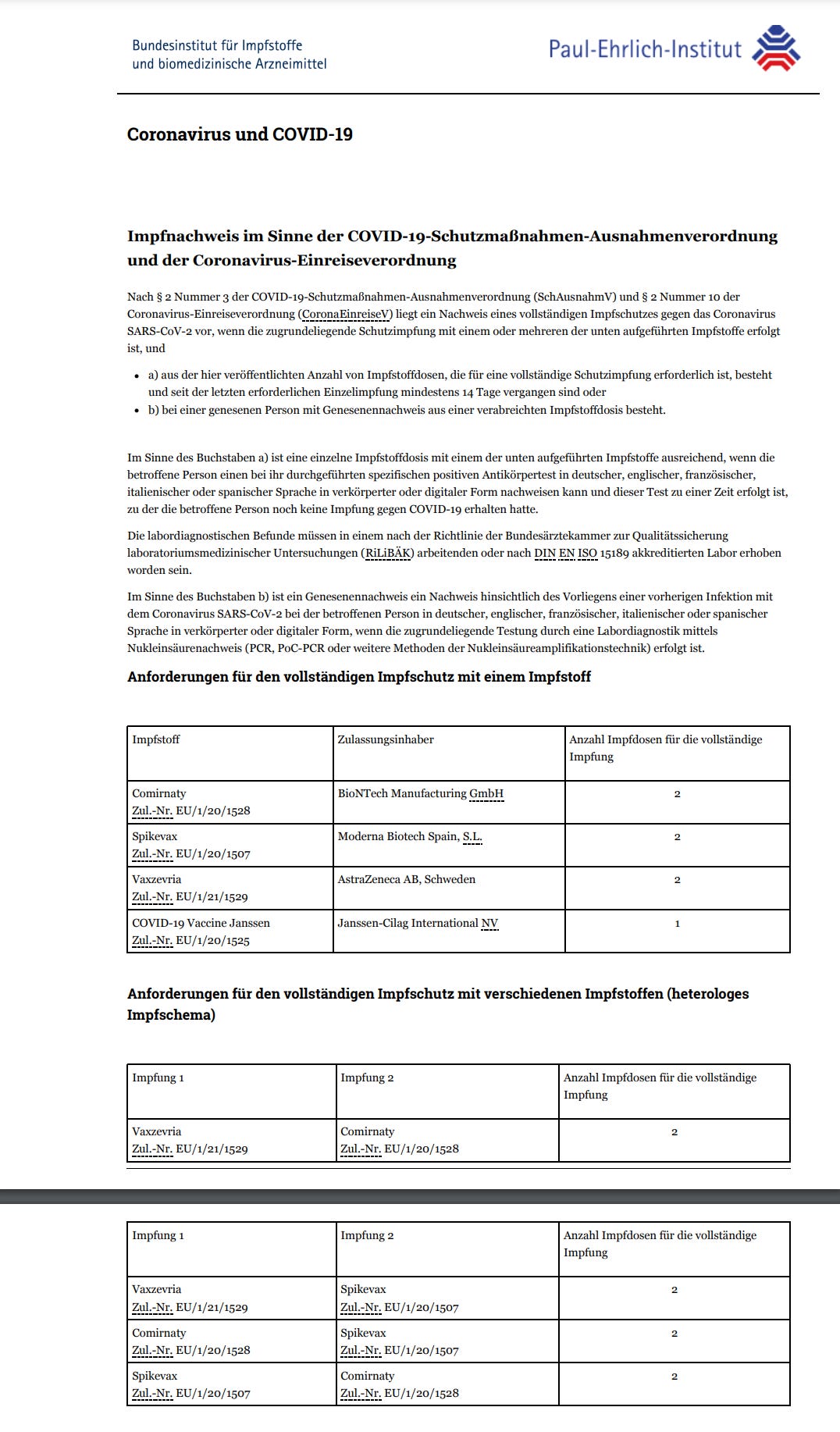 Das Paul-Ehrlich-Institut (PEI) definiert „vollständigen Impfschutz“ auf Grundlage der Schutzimpfungs-Ausnahmeverordnung (SchAusnahmV) und Coronavirus-Einreiseverordnung (CoronaEinreiseV). Demnach liegt ein vollständiger Impfschutz gegen SARS-CoV-2 vor, wenn ein in der EU zugelassener Impfstoff verwendet wurde, die notwendige Anzahl der Impfungen erreicht ist – bei Corona-Impfungen meist zwei - und das nötige Zeitintervall nach Impfung vergangen ist, damit sich die Impfstoff-Wirkung im Körper entfalten konnte.